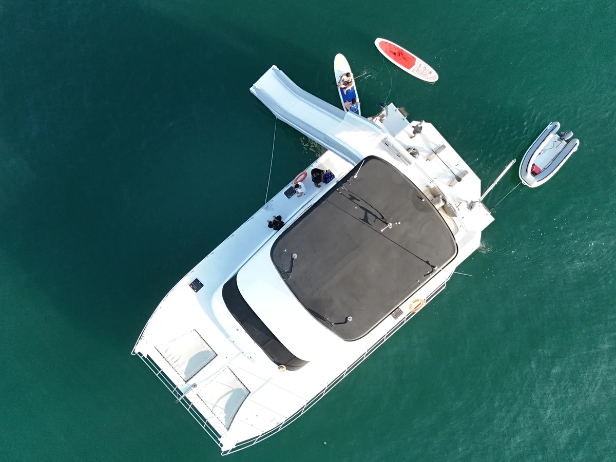 Experience our pristine 52' power catamaran for charter in Phuket – still brand-new after 5 years. Perfect for groups up to 40 guests, ideal for weddings, parties, and corporate events. Features spacious flybridge, air-conditioned saloon, 3 cabins, waterslide, paddleboards, and snorkeling gear. Explore Phang Nga Bay's limestone cliffs, Koh Yao Yai's beaches, or Koh Hong Krabi's crystal waters.