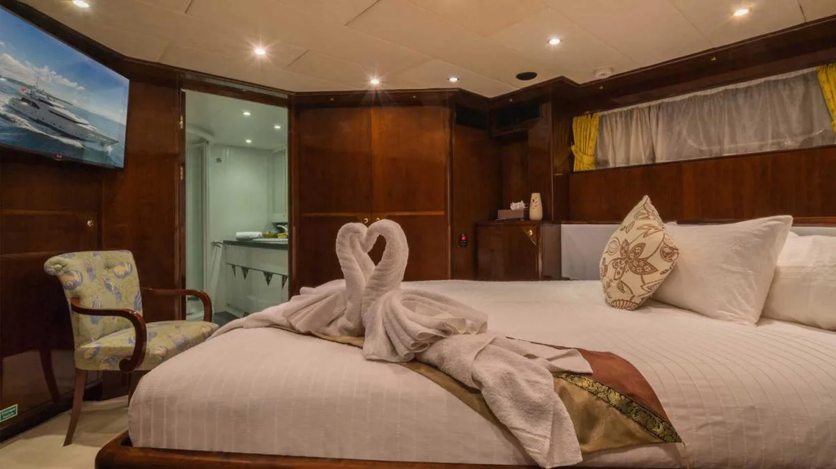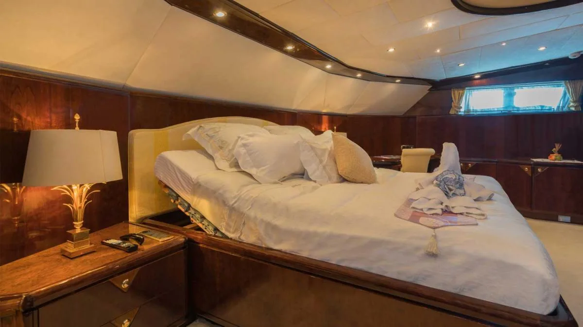 Welcoming eight guests, the yacht offers four luxurious staterooms. Her full-beam, main-deck master suite is fitted with a skylight to dazzle stargazers, and includes a king-size bed, en-suite bathroom with gold-plated fixtures, and a private office with an optional sofa bed for a 9th adult or child guest. The VIP and two additional double staterooms are located on the lower deck, and complete with their own en-suite bathrooms.