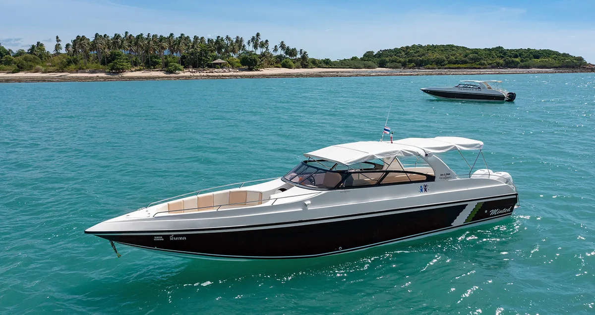 Sail from Koh Samui to Koh Phangan on a sleek 38ft speedboat, diving into 4 hours of private adventure for up to 15 guests with sun and sea.