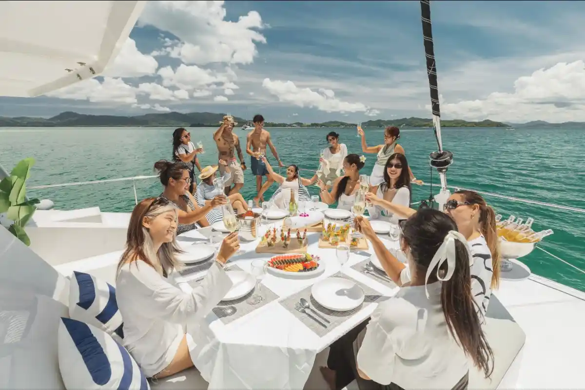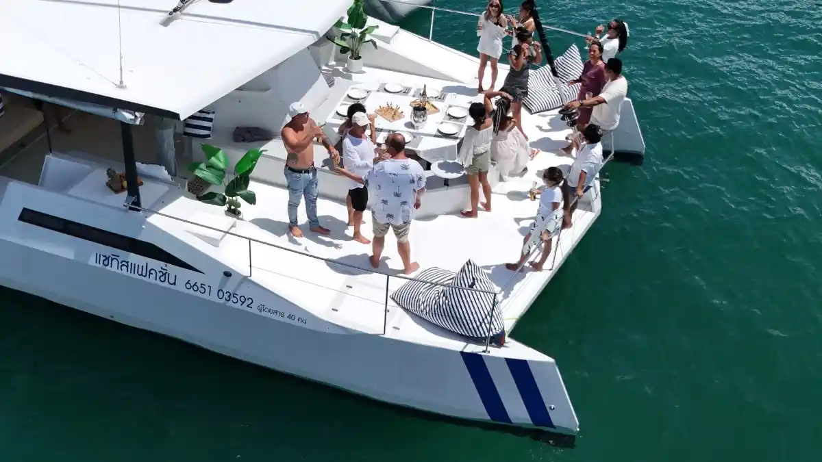 The Selectione handles these island-hopping adventures like a dream, with space for up to 40 guests across her twin hulls. This Large Group Boat 55ft makes perfect sense for Thailand's social charter culture where friends, family, and colleagues gather to explore together. What matters in Thai waters is having enough deck space for everyone to find their perfect spot – whether that's sunbathing on the bow nets or mixing cocktails at the bar.