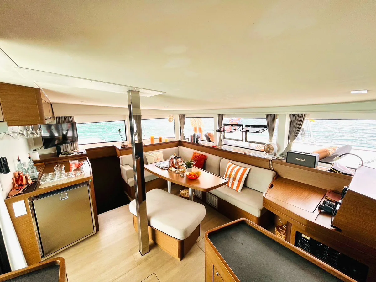 This sleek Lagoon catamaran for charter in Koh Samui is designed for comfort and performance, with space for up to 15 day guests. The sleeping accommodations for 8 in 4 air-conditioned cabins, each with its own ensuite bathroom, make her the best choice for for multi-day cruises around the islands of Samui.