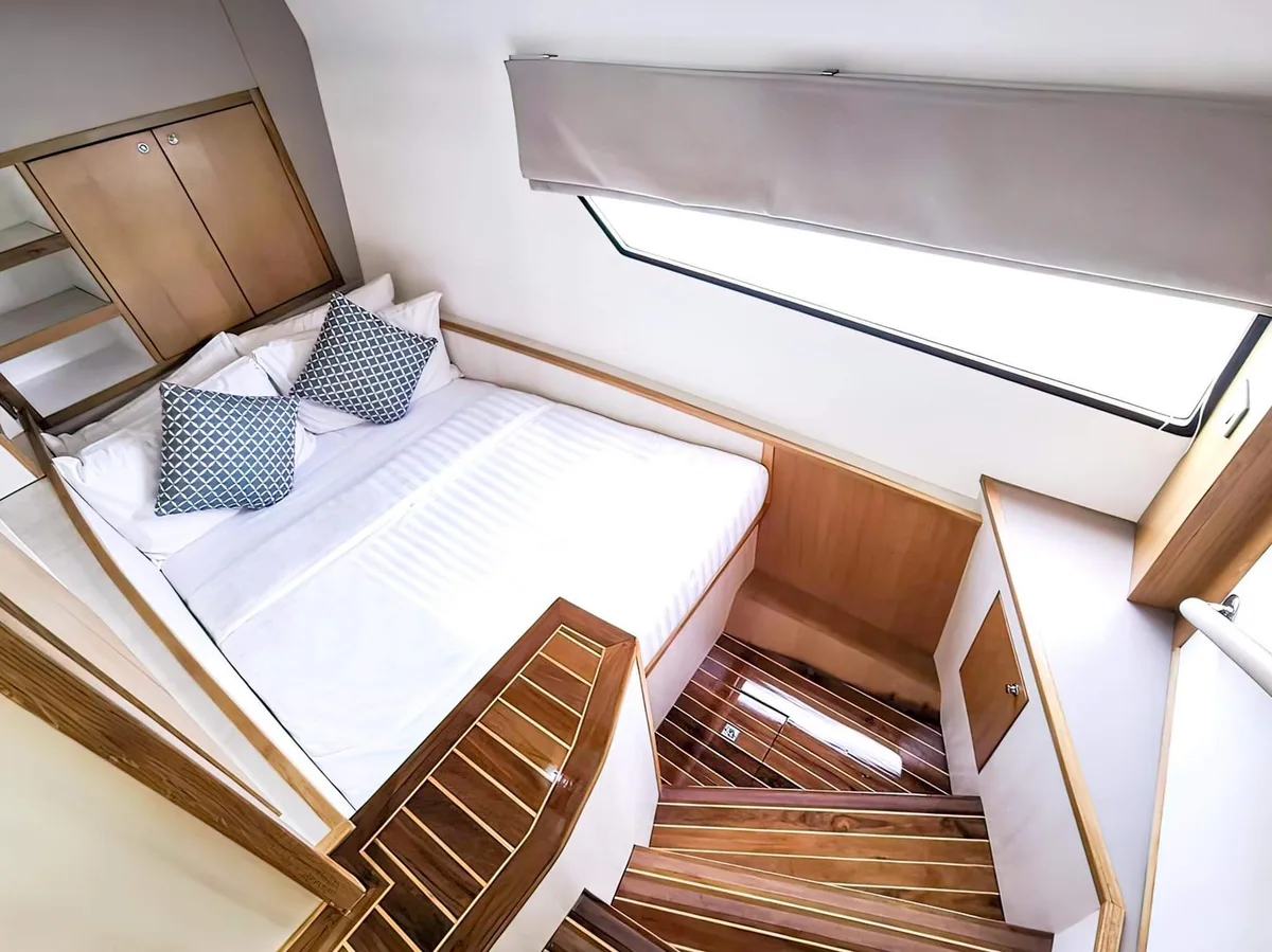 A fast speedster that comfortably takes smaller groups of up to 15 people to the most beautiful spots on the Andaman Sea and, not least thanks to the flybridge and the full equipment, is pure enjoyment. Private yacht charter in Phuket in best form!