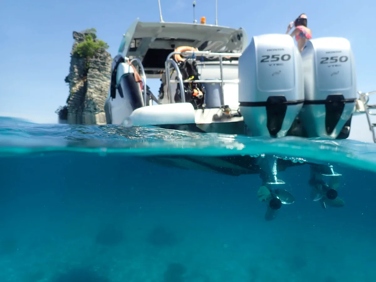 With 2 powerful engines and full dive boat equipment, this private deluxe speedboat takes you and up to 18 friends (max 6 divers) at top speed to the area's best diving and snorkeling spots, secluded beach picnics and every adventure imaginable.