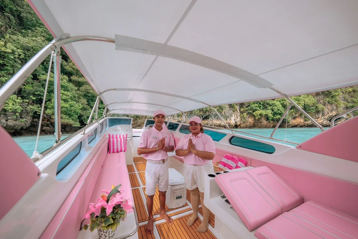 In the midst of a vibrant marine dance, where the echo of laughter rivaled that of waves against rocks, lies the enchanting Phi Phi Islands. This magnificent archipelago is a treasure trove waiting to be explored aboard the sleek Private Speedboat 41ft, aptly named Speedboat Pink Dolphin. With its unparalleled speed and agility, this custom build ensures you beat the crowds to iconic spots like Maya Bay and unspoiled hidden lagoons.