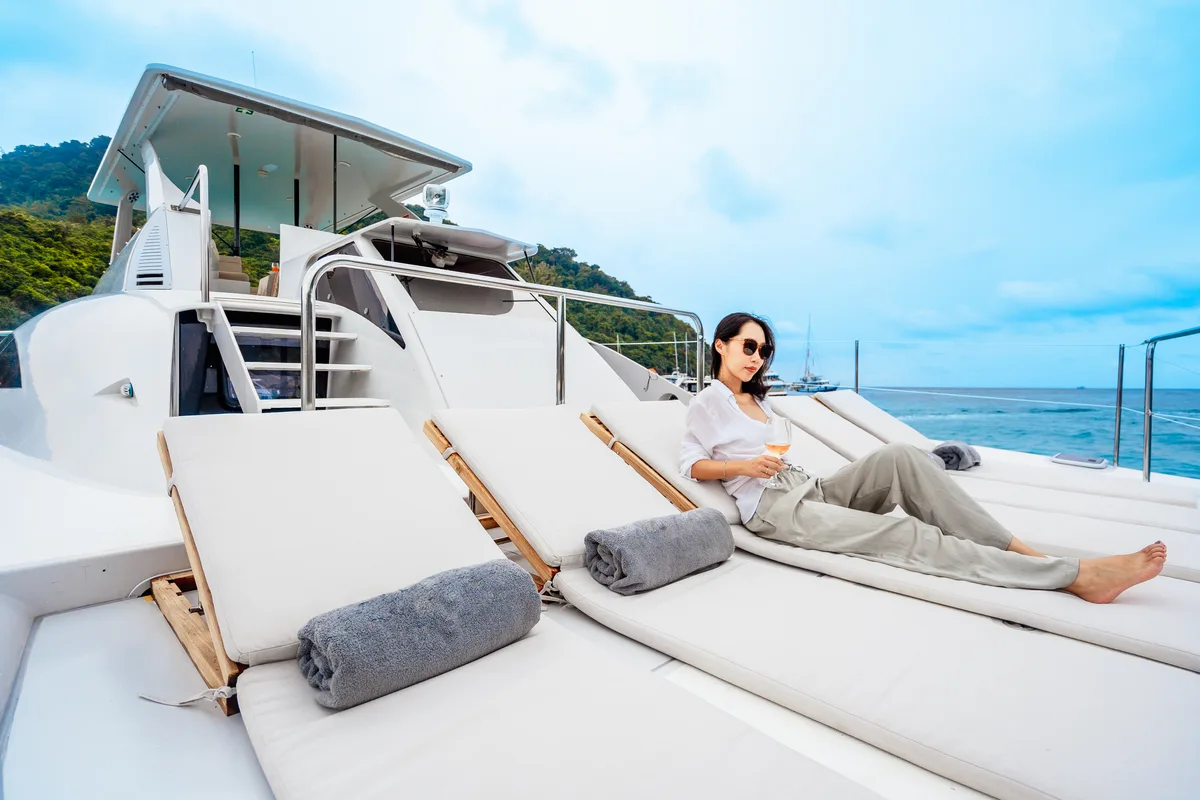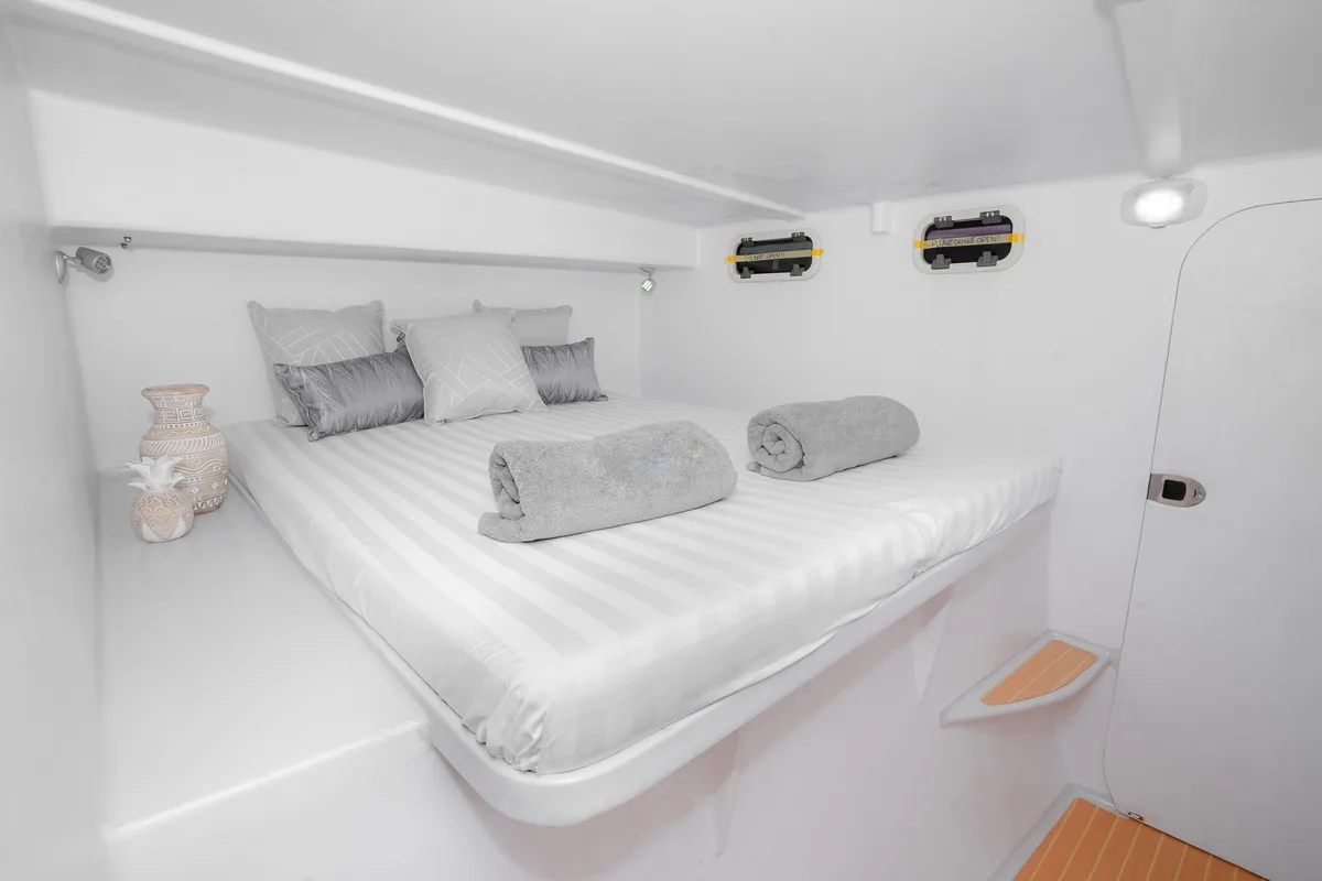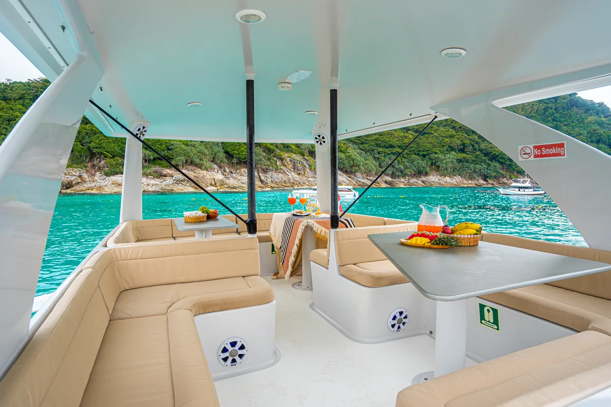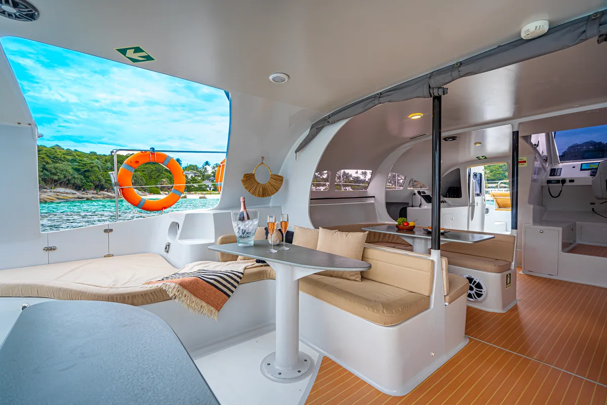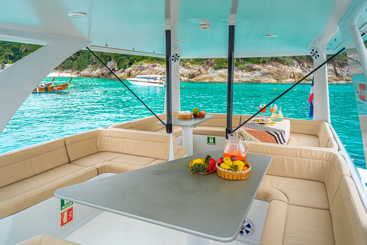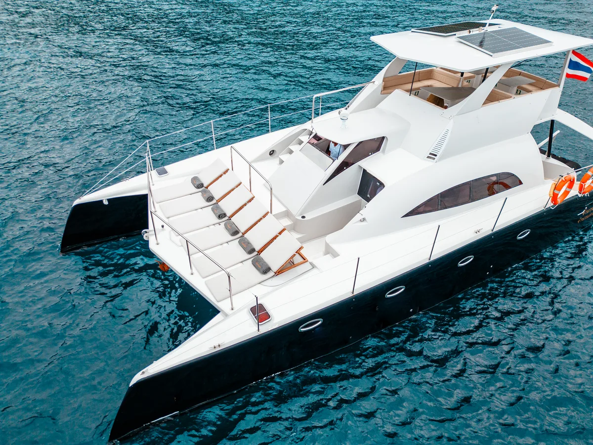 Rollende Wellen und sonnengetränkte Tage in Thailand sind wie eine endlose Party, bei der der Ozean sowohl Ihr Tanzparkett als auch Ihre Kulisse ist. Stechen Sie in See mit der eleganten Black Panther, einem atemberaubenden Power-Katamaran 47ft, gemacht für Abenteuer und Lachen mit bis zu 30 Freunden oder der Familie. Ihr erstes Ziel? Die atemberaubende Coral Island / Banana Beach (Koh Hey). Mit kristallklaren Gewässern, die perfekt zum Schnorcheln sind, finden Sie leuchtend bunte Fische, die jeden Regenbogen vor Scham erröten lassen könnten.