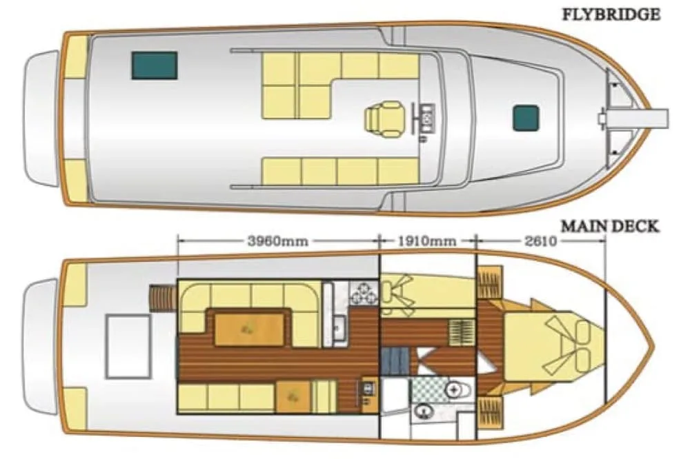 The upper, shady seating level is just as popular as the front sunbathing area. But the fully equipped galley and the spacious air conditioned lounge also offer a welcoming atmosphere inside. The large Master Double Cabin in the front and a Twin Bunk Cabin offer 4 beds for overnights.