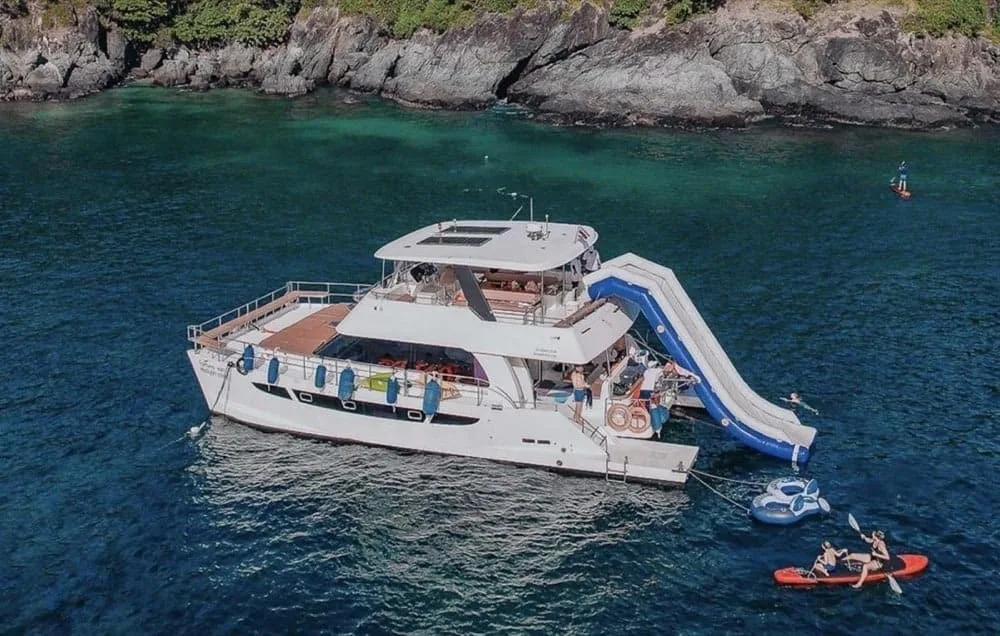 This is the right charter yacht for groups who like to sail with fun and plenty of space. Perfect power catamaran in Phuket for parties with family or friends. Water slider and inflatable pool included (on full-day tours).